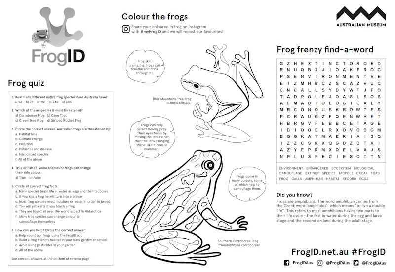 FrogID’s curriculum-aligned school resources introduce students to Australian frog biology, covering anatomy, life cycles, and ecological roles. Students explore frog habitats, adaptations, and the vital role frogs play in healthy ecosystems. The materials also highlight threats facing frog populations and guide students in practical steps for designing and constructing frog-friendly habitat to support local biodiversity. These resources support inquiry-based learning and foster understanding of biology, species conservation and ecosystem dynamics.
